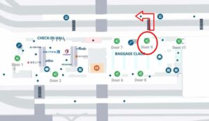③Baggage Claim近くの自動扉Door 9から建物の外に出て、横断歩道を渡り、「Inter-City Shuttle」と書かれた青い標識の場所に向かいます。(ターミナル4の場合Door5から出ると近い)
