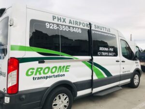 ④白い車体に緑で「Groome Transportation」と書かれたバスが到着したら、ドライバーに「名前」「行先(セドナ、ホテル名)」を伝える。(同じバスで行先が違う場合があるので必ず確認!)